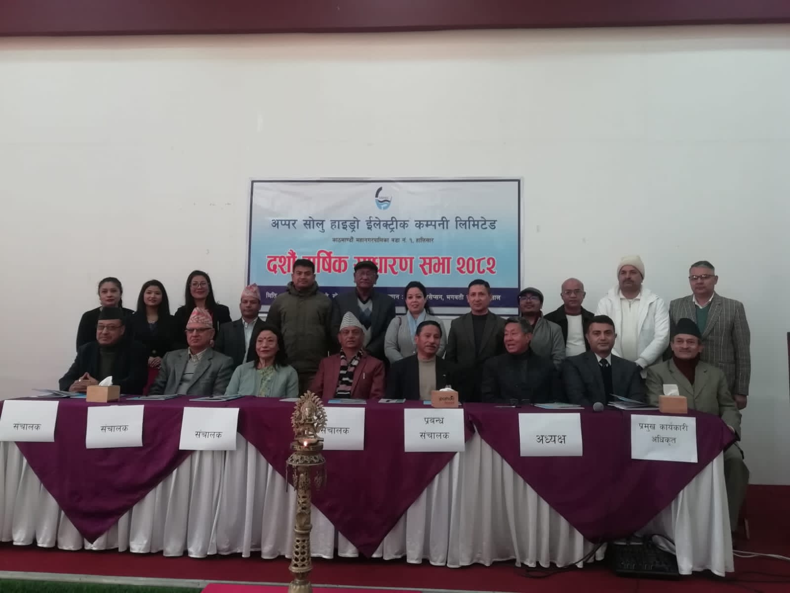 काठमाडौं – अपर सोलु हाइड्रोइलेक्ट्रिक कम्पनी लिमिटेडले आज आफ्नो १०औँ वार्षिक साधारणसभा (AGM) सफलतापूर्वक सम्पन्न गरेको छ। सभामा सेयरधनीहरूले आर्थिक वर्ष २०८१/८२ को कम्पनीको वित्तीय कार्यसम्पादनको समीक्षा गर्नुका साथै लेखापरीक्षक नियुक्ति सहितका प्रमुख वैधानिक प्रस्तावहरू पारित गरेका छन्।