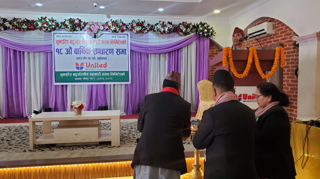 ललितपुर । युनाइटेड बहुउद्देश्यीय सहकारी संस्था लिमिटेडको १८औँ वार्षिक साधारण सभा ललितपुरको बागडोलस्थित वेभा पार्टी प्यालेसमा भव्य रूपमा सम्पन्न भएको छ। सहकारीका अध्यक्ष मीनमान श्रेष्ठको अध्यक्षतामा सम्पन्न सभामा सेयर सदस्यहरूको उल्लेख्य सहभागिता रहेको थियो।