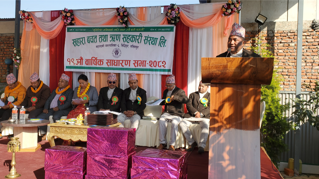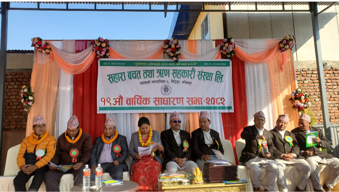 ललितपुर, २७ पुस २०८२ — ललितपुर महानगरपालिकाको महालक्ष्मी नगरपालिका–सिद्धिपुरमा रहेको सहारा बचत तथा ऋण सहकारी संस्था लिमिटेडको १९औँ वार्षिक साधारणसभा भव्य र सभ्य वातावरणमा सम्पन्न भएको छ। महालक्ष्मी नगरपालिकास्थित शिवम ब्यांकेटमा आयोजित उक्त साधारणसभामा संस्थाका अध्यक्ष, सञ्चालक तथा पदाधिकारीसहित सेयर सदस्यहरूको उल्लेख्य सहभागिता रहेको थियो।