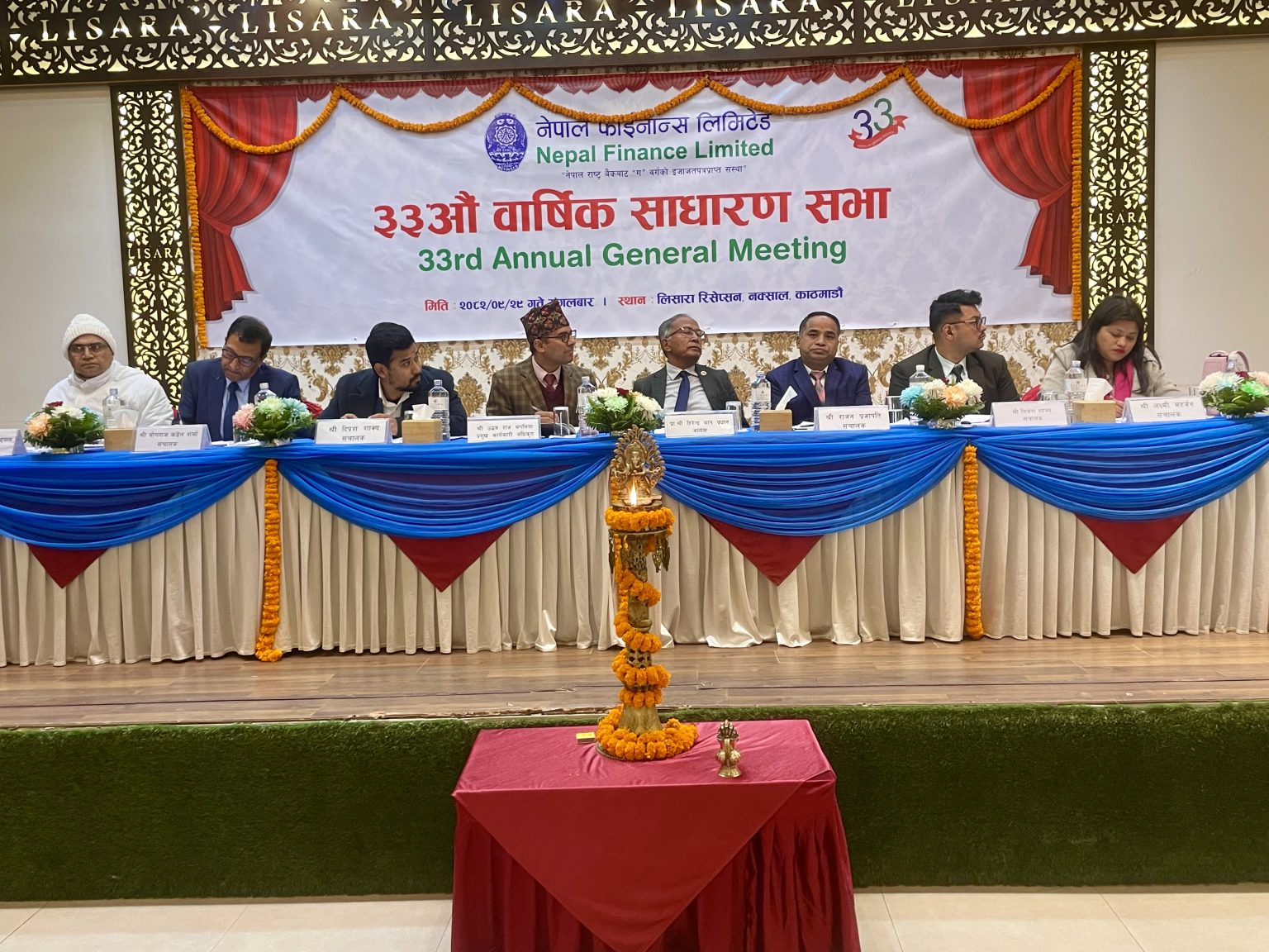काठमाडौं । नेपाल फाइनान्स लिमिटेडले आफ्नो ३३औँ वार्षिक साधारण सभा (AGM) वि.सं. २०८२ पुस २९ गते (जनवरी १३, २०२६) सफलतापूर्वक सम्पन्न गरेको छ। साधारणसभा काठमाडौंस्थित लिसारा रिसेप्सन, नक्सालमा बिहान ८:३० बजेबाट आयोजित भएको थियो।