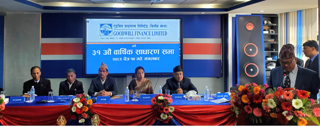 काठमाडौं । गुडविल फाइनान्स लिमिटेडको ३१औं वार्षिक साधारण सभा (एजीएम) आज सफलतापूर्वक सम्पन्न भएको छ । नेपालका वित्तीय क्षेत्रमा तीन दशकभन्दा लामो अनुभव बटुलेको संस्थाले आफ्नो स्थिरता र विस्तार यात्रामा अर्को महत्वपूर्ण उपलब्धि हासिल गरेको जनाएको छ।