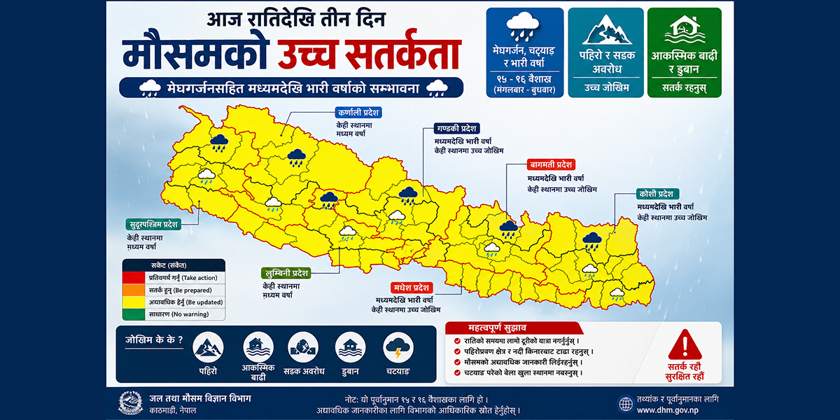 मौसमविदहरूका अनुसार अहिले सक्रिय बनेको प्रिमनसुन प्रणाली आज रातिदेखि थप बलियो हुने भएकाले पहाडी तथा हिमाली क्षेत्रमा पहिरो, साना खोला–नालामा आकस्मिक बाढी तथा सहरी क्षेत्रमा डुबानको जोखिम उच्च रहनेछ। विशेषगरी काठमाडौं उपत्यका र वरपरका भूभाग, पूर्वी नेपालका अधिकांश जिल्ला तथा मध्य नेपालका पहाडी क्षेत्रमा ठूलो पानी पर्ने सम्भावना रहेको जनाइएको छ।